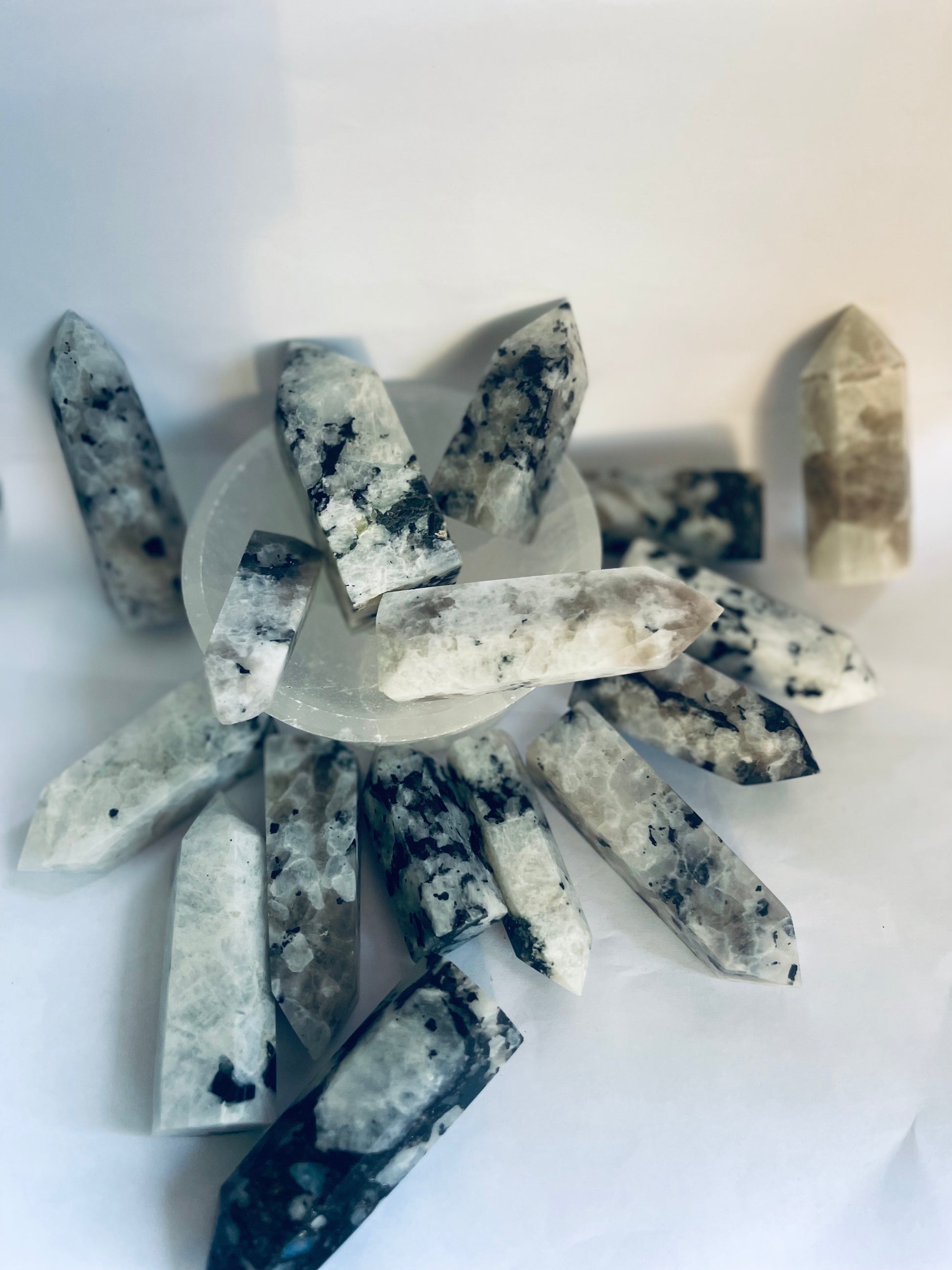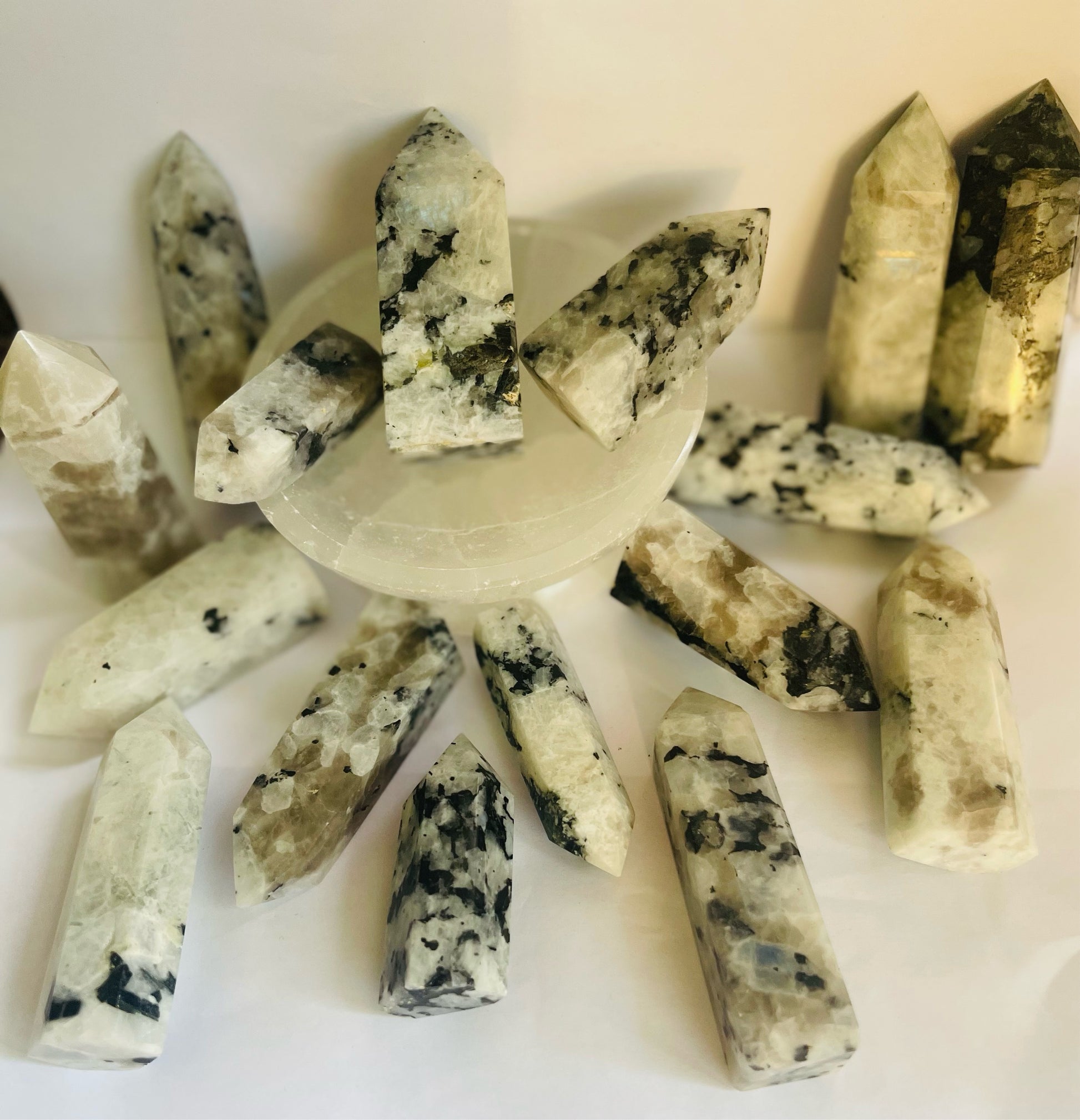 Our Moonstone Towers Medium radiates a calming energy while bringing a sense of balance to its surroundings. Boasting a unique black and white shiny color, this tower radiates a unique kind of light that helps reduce stress and anxiety. Enjoy the blissful peace of this decor item that blends design with serenity.
